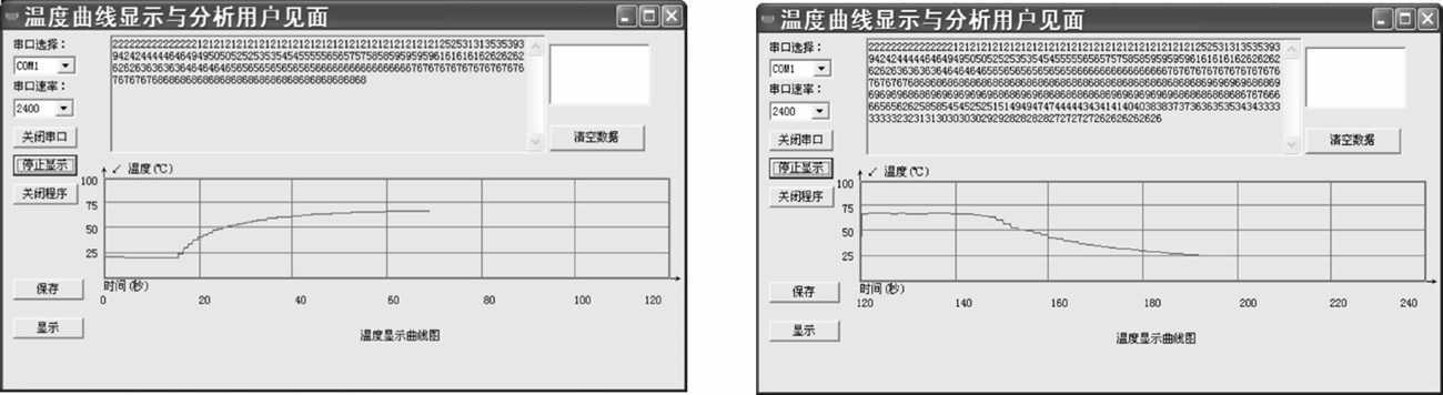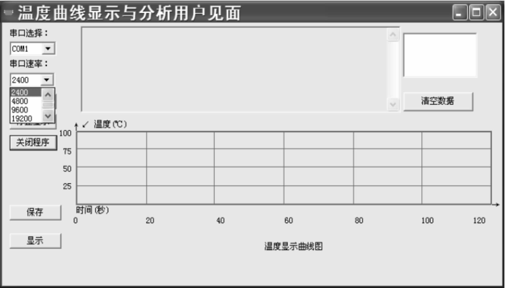 通過單片將數據傳遞給PC機,PC機將接收到的數據在溫度曲線顯示與分析用戶見面顯示出來。本軟件設計中還有串口選擇、波特率的選擇、停止顯示、清空數據、關閉程序等基本功能。這里主要是溫度值的曲線繪制,然后再將溫度值保存起來并進行再顯示的操作。從而達到實時采集與分析的功能。溫度曲線顯示與分析用戶界面如圖4所示。