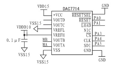 DAC7714是美國TI公司推出的一款4通道12位串行輸入、電壓輸出型DA轉(zhuǎn)換器。其供電電壓為±15 V,可以實現(xiàn)輸出自動保持,采用此串口芯片除了具有節(jié)省單片機(jī)資源的優(yōu)點外,還具有同時輸出多路0~10 V(參考電壓為+10 V和0 V),特別適用于MCU資源緊缺而控制通道比較多的場合。
