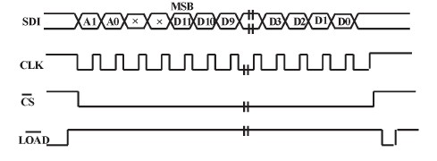 DAC7714完成一次數(shù)模轉(zhuǎn)換,需要在CS為低電平期間,在CLK的上升沿,串行輸出16位數(shù)據(jù)到SDI.16位數(shù)據(jù)中,前兩位A1和A0的組合將決定對某一通道進(jìn)行轉(zhuǎn)換輸出(00-A通道、01-B通道、10-C通道、11-D通道),接下來兩位為無效位,最后的12位數(shù)據(jù)即真正需要轉(zhuǎn)換的數(shù)據(jù)。其工作時序圖如圖2所示。