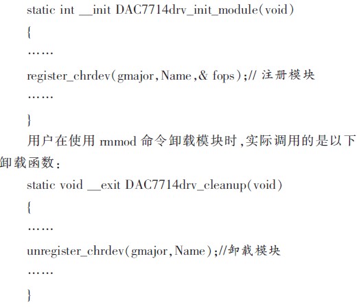 DAC7714驅(qū)動程序作為設(shè)備文件,同樣分為open、write、release等幾個操作。對于內(nèi)核來說,DAC7714屬于字符型設(shè)備,并為該設(shè)備命名為Name[]="DAC7714drv".該模塊在使用時采用insmod命令進(jìn)行動態(tài)加載,使用rmmod命令進(jìn)行動態(tài)卸載。DAC7714驅(qū)動程序主要由注冊函數(shù)、注銷函數(shù)、初始化函數(shù)、DA輸出函數(shù)構(gòu)成。