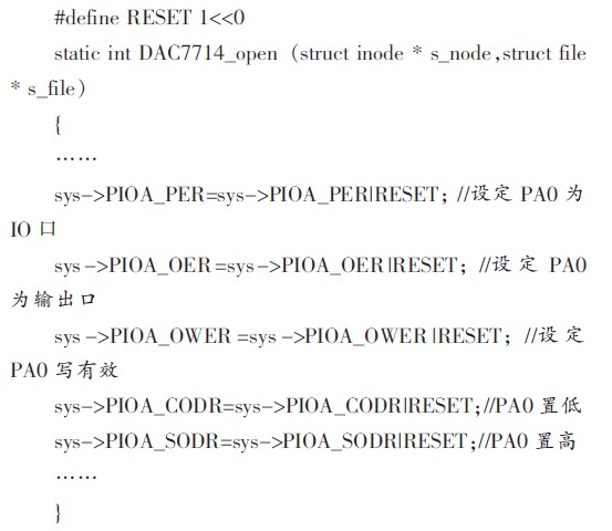 應(yīng)用程序中使用open函數(shù)打開DAC7714設(shè)備時,實際調(diào)用以下函數(shù)完成對控制器相應(yīng)引腳的初始化操作(以PA0連接RESET為例介紹):