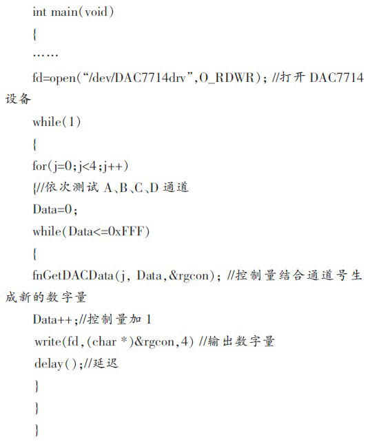 在測試程序中,實現(xiàn)對DAC7714的4路輸出分別進(jìn)行測試。測試方法是,對于指定的數(shù)字量,通過萬用表或示波器測量DAC7714相應(yīng)通道的電壓輸出值,若該值與理論值一致,則表明驅(qū)動程序正確。