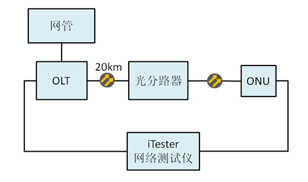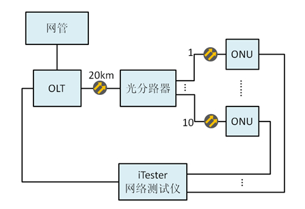 網絡基礎性能測試方案的結構如圖2所示,被測系統包括1個OLT和10個ONU,每個OLT和ONU分別與測試儀相連。其中每個ONU只需提供一個端口連接至iTester網絡測試儀端口。OLT與光分路器之間接入20km盤纖。
