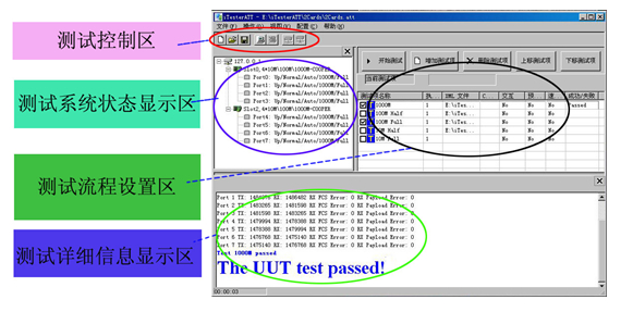 同時,針對PON設備的測試,iTesterATT還提供了信而泰獨創的自動化會聚測試方法, 可顯著提高PON設備的測試效率,因此在PON產品測試領域得到了廣泛的應用。iTesterATT軟件界面分為測試系統控制區、測試系統狀態顯示區、測試流程設置區和測試詳細信息顯示區。如圖5所示。