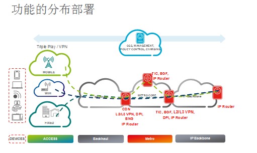 那么,城域網應該怎么走向智能化,進而帶動整個承載網絡的智能化呢?總結起來,分成兩個步驟,一是功能的分散部署,二是控制功能的分離和集中部署。我們先來看看城域網的現狀。說到城域網,自然會提到兩個關鍵網元,一個是BRAS,另一個是SR,雖然在單邊緣思潮的推動下,逐漸實現了平臺的二合一,也實現了統一網管,但如果用固移融合的標準來衡量,還有很長的路要走,最終PGW和BRAS/SR是要成為單一節點的。那么,問題就來了,目前身處城域網的BRAS/SR和身處移動核心網的PGW要想融合,勢必要先在城域網或移動核心網之間做出選擇。如果選在核心網,顯然符合移動主導固移融合的趨勢,但移動核心網布點相對較少,遠離用戶,容易造成傳輸瓶頸;如果選在城域網,則會造成管理和策略部署的困難。因此,我們提出了上面所說的“一分布,二集中”的建設策略,一分布,是指先實現功能分布,二集中,是指再實現控制的集中。短期內,如果所有固網流量都經過移動核心網,其帶來的沖擊將是巨大的,同時,智能化帶來的附加價值還不明顯,因此可以先將移動網絡的功能向城域網分布。這里所說的功能是多樣的,包括PGW,CDN,FW,DPI等,各個節點按照需要在多功能平臺上靈活部署相關固網和移動網絡功能模塊。中長期,則可以采用SDN等相關技術,將控制層集中部署到運營商數據中心,可以采用云技術加以實現,已經部署的多功能節點則更多的扮演數據轉發的據說。這樣的部署策略,可以在運營商長期利益和短期效益直接實現平衡,同時,“短期”更為“長期”打下了良好的基礎。