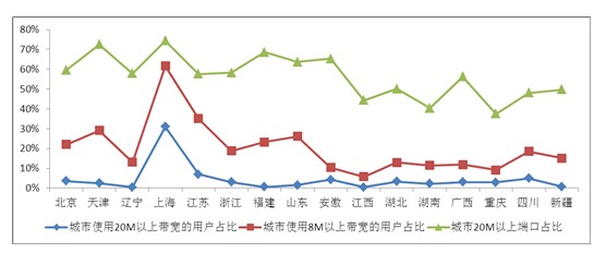 部分省份城市地區高帶寬端口與使用高帶寬產品的用戶占比