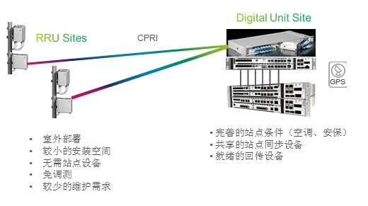 目前無線基站通常采用main-remote 結構,也就是把傳統(tǒng)基站的基帶處理部分(BBU)和射頻部分(RRU)分開的基站設備形態(tài),BBU與RRU之間采用高速CPRI光接口連接,BBU和RRU即可共站放置,也可分站放置。運營商可將多個BBU集中放置在已有的宏站,而只在新站布放RRU。由于RRU遠端模塊靈巧輕便、便于安裝維護,對機房條件和配套要求較低,系統(tǒng)CAPEX和OPEX低,因此可以大范圍高密度地使用,從而達到建設高容量廣覆蓋的無線網(wǎng)絡目的。