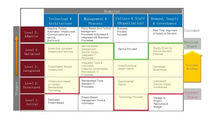 圖二綠線狀態(tài)是通過調研、分析,建議該企業(yè)3年內的應達到的目標,總體上達到4級水平,但是由于組織架構需要配合整個企業(yè)的管理,在該維度只需要達到3級水平即可。這樣在每一個維度上都有對應的提升內容作為路線圖,每個級別的提升都對應實質性內容可以很好地指導電網企業(yè)在技術和架構、管理和流程、組織、運營上一步一個腳印,分級、分步驟地提升自己的通信能力,應該指出的是,每個維度都應該逐級提升而不是一蹴而就從1級直接提升到4級,因為每一級都有其內在的發(fā)展規(guī)律。