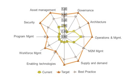 如圖四所示,根據調研分析報告繪制現狀在每一個調研內容所處的級別,紫色線是全球最佳實踐所處的位置,提供對標參考。桔色線是根據SGCMM提出建議的目標位置