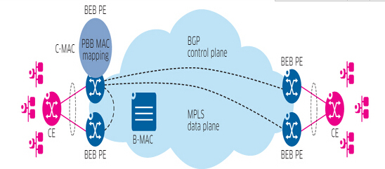 PBB-EVPN將IEEE 802.1ah運營商骨干網(wǎng)橋(PBB)與EVPN功能結合起來,通過架構在MPLS之上的全主用多鏈路機制,提供超大網(wǎng)絡的擴展能力。它通過使用骨干網(wǎng)MAC對用戶MAC進行匯聚,減少了EVPN中的MAC數(shù)量,這類似于IP中的路由匯聚。骨干網(wǎng)邊緣網(wǎng)橋(BEB)PE路由器僅通過BGP通告干網(wǎng)MAC。客戶MAC與運營商MAC的映射是在PE的數(shù)據(jù)平面中學習到的。MPLS運行于核心網(wǎng)絡的控制平面和數(shù)據(jù)平面。該架構可部署于現(xiàn)有的MPLS網(wǎng)絡之上,以提供更高的MAC擴展性,或用于干網(wǎng)來屏蔽用戶MAC。