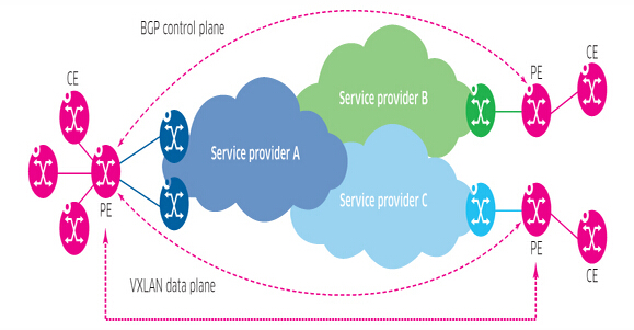 EVPN-VXLAN可工作于任何IP網(wǎng)絡之上,為企業(yè)提供靈活的L2和L3 VPN進行站點互聯(lián)。該應用僅要求站點間IP互通。IP業(yè)務提供商不需要部署MPLS或任何特殊的配置。用戶的網(wǎng)絡鏈路上甚至可能包含若干種不同的IP網(wǎng)絡—例如用戶的網(wǎng)絡運維人員可能在不同的地點購買來自不同供應商的IP服務。運營商的網(wǎng)絡對于EVPN而言是完全透明的,而EVPN拓撲對于運營商而言也是完全透明的。所能看到的僅僅是IP流量。在EVPN中的路由和MAC/IP通告由PE間的IBGP來控制。