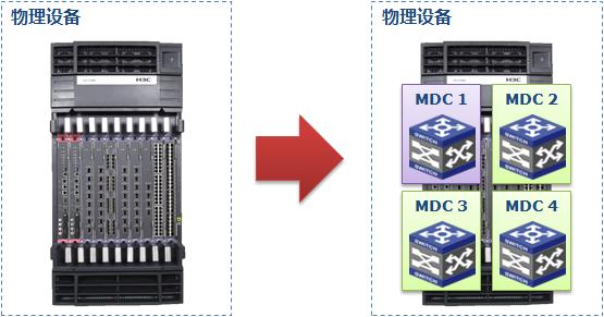 1:N虛擬化可以實現將一臺物理網絡設備通過軟件虛擬化成多臺邏輯網絡設備,在軟件上將網絡設備操作系統的數據平面、控制平面、管理平面進行了完全的虛擬化,各用戶進程在每個邏輯虛擬交換機上獨立啟動運行,各個虛擬交換機共用一個操作系統內核。在硬件上,將網絡設備的硬件資源進行了虛擬化,不僅可以將板卡、端口等硬件資源劃分到獨立的邏輯設備,而且可配置每個邏輯設備的CPU權重、內存、存儲空間等資源。