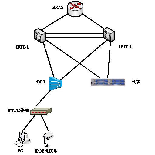 本測試分為設備基本能力測試、虛擬化能力測試和現場業務測試三個部分,測試選取市區中心局節點作為測試端點,本次測試的實際拓撲圖如下: