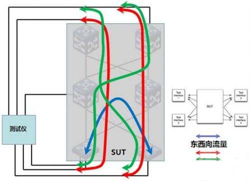 數(shù)據(jù)中心的業(yè)務流量主要分為服務器之間的內(nèi)部流量和用戶端與服務器之間的外部流量,也稱為“東西向”流量和“南北向”流量。對應RFC規(guī)范中定義的測試流量類型則是“非網(wǎng)格型”和“部分網(wǎng)格型”,兩者的組合可以看作“全網(wǎng)格型”.由于轉發(fā)路徑和設備的處理方式不同,HA測試中需要同時關注這兩類流量的故障恢復情況。如圖1所示。