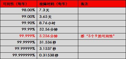 表1是不同等級的可用性與總故障時間(以一年為時間段)的對應關系表: