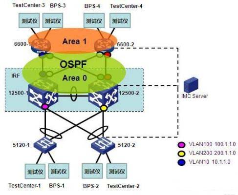 如圖4所示,這是典型的數(shù)據(jù)中心網(wǎng)絡(接入5120+核心12500)兩層拓撲結構,核心層兩臺S12500采用IRF模式,可以簡化網(wǎng)絡邏輯結構,提高設備利用效率并簡化網(wǎng)絡管理。接入層采用5120EI交換機做二層雙上行接入,接入層鏈路為跨機筐鏈路聚合。出口設備采用SR6600路由器與12500交換機運行OSPF或BGP路由協(xié)議,12500與SR6600之間都為雙上行三層等價鏈路。其中,SR6600模擬了廣域網(wǎng)出口設備,但在真實場景中使用高端交換機較多。5120EI和SR6600分別連接兩個應用層測試儀(構造具有狀態(tài)特征的UDP和TCP流量)端口。通過對設備故障和鏈路故障的模擬,可以直觀得到組網(wǎng)中應用層業(yè)務的收斂時間、IRF和LACP的HA切換時間等。