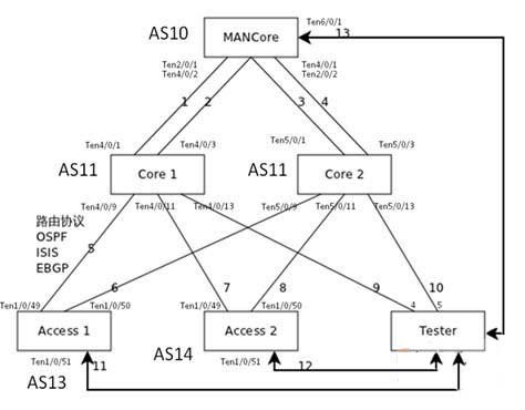 圖5的測試組網(wǎng)也模擬了典型的數(shù)據(jù)中心網(wǎng)絡。接入層交換機使用兩臺真實設備,在大規(guī)格測試項中會使用測試儀模擬更多的接入交換機。核心設備之間采用普通的三層路由結構,機房或站點間的出口設備“MAN Core”采用一臺高端交換機模擬,MAN Core通過多條等價三層鏈路與內(nèi)部核心Core1和Core2連接。