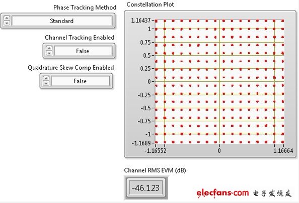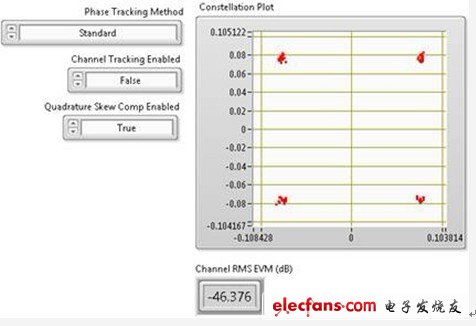 圖9. 上圖顯示了80 MHz 802.11ac信號進行相位跟蹤對EVM數的影響。該圖表在256-QAM信號圖中僅顯示了4個符號。