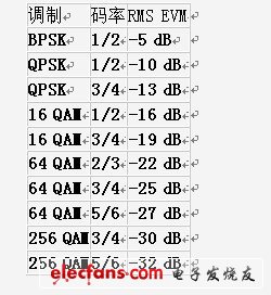 隨著調制方式越來越復雜,保持高質量的信號變得更加重要。表1顯示了802.11ac中不同調制方式的RMS EVM要求。