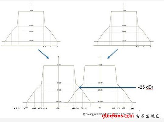 工程師可以通過兩個同步的發生器或分析儀生成并采集80+80信號。如圖14所示,如果兩段屬于不同波段,將在每段中應用常規80 MHz頻譜屏蔽,但當兩段屬于同一波段并且為連續時,將在信號中應用疊加的頻譜屏蔽。