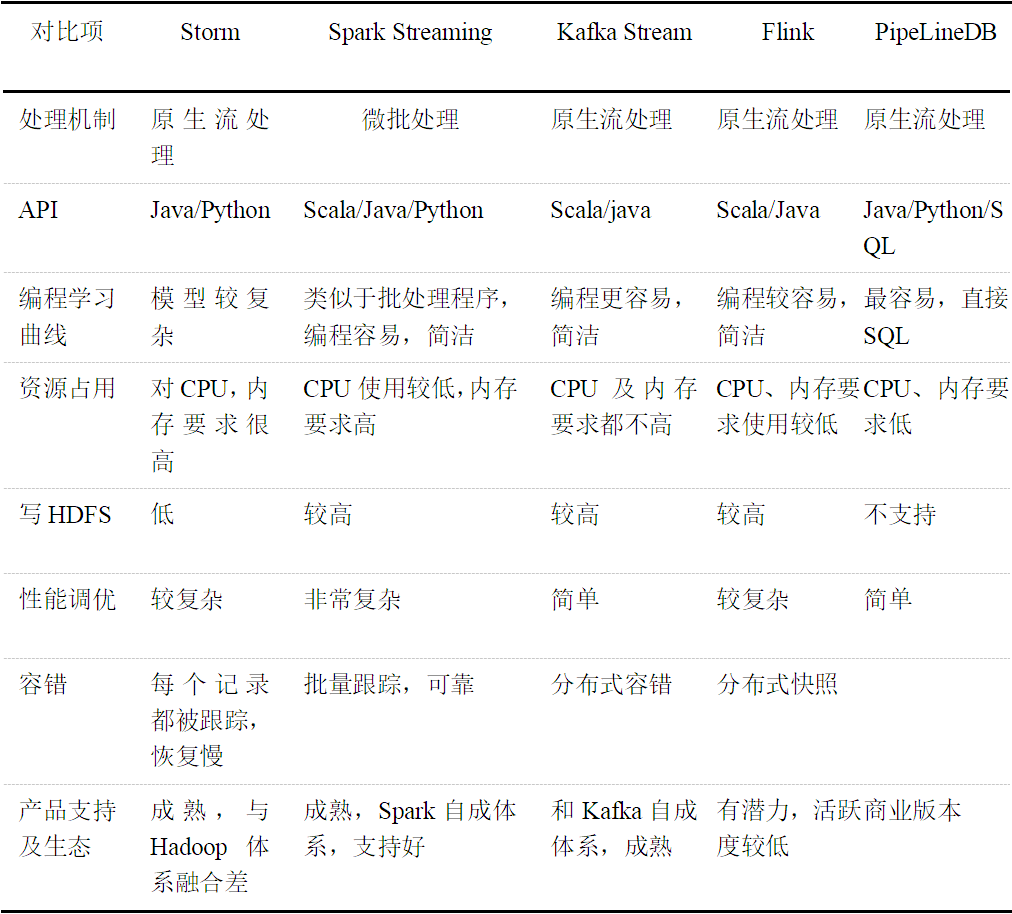 上文提到的5種流式處理框架對比如表1所示: