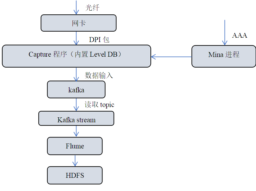 Mina進程是一個JAVA程序,基于mina框架開發,主要接收AAA數據包,獲得用戶賬戶信息,解析計算,并持久化到redis,最后發送給抓包(Capture)程序。Capture程序由C語言編寫,使用開源pcap抓取網卡http包,解析,結合用戶帳號資料,把DPI寫入到Kafka中。Kafka stream完成DPI的實時清洗和轉換工作。