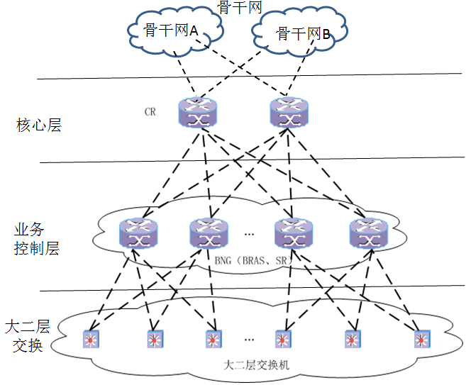 現有的IP城域網普遍采用分層結構,包括核心層、業務控制層和大二層匯聚層等三層結構。核心層一般由一對功能強大的核心路由器組成,用于轉發管理。業務控制層由寬帶遠程接入服務器(BRAS)、全業務路由器(SR)等寬帶網絡網關控制設備(BNG)設備組成,用于完成寬帶用戶或專線用戶的數據接入、認證、計費及管理轉發等功能。大二層匯聚層由接入交換機組成,用于接入用戶,完成用戶數據上傳。現有的IP城域網層級架構比較清晰,但同時也面臨著很多的問題,需要進行網絡架構重構解決。