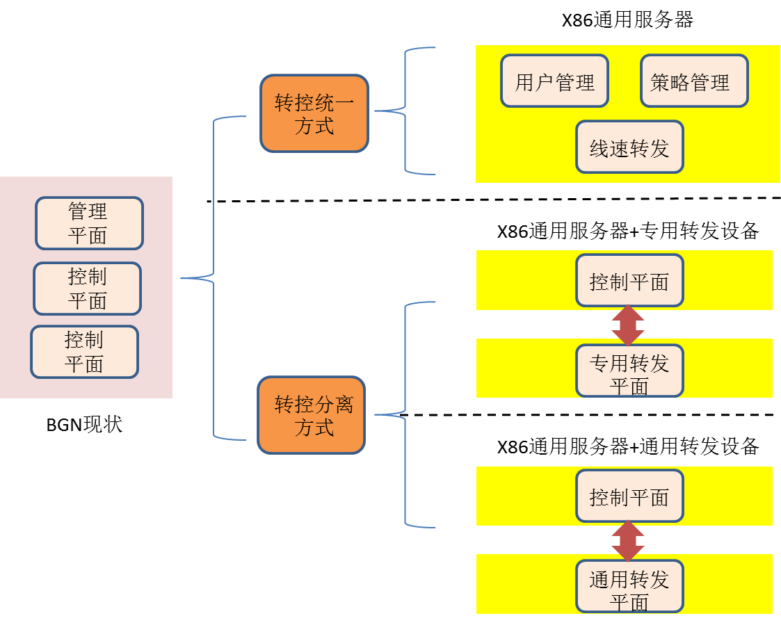 第二種方式采用標準x86服務器實現控制面功能,轉發面根據采用的設備類型不同,又分為專用轉發面和通用轉發面2條路線。在專用轉發面下,現有的BRAS設備可改造用于構建通用交換網絡。通用轉發面則使用通用轉發硬件如x86服務器進行構建,這種方式可完成精細化的業務及流量控制。