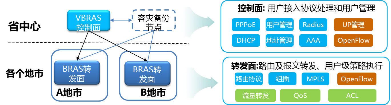 在運營商的網絡里面,vBRAS控制面定位為用戶控制管理部件,負責用戶接入管理、認證計費、用戶會話及策略管理等,建議全省集中部署。將BRAS控制面集中后,安全性和穩定性要求更高,建議通過部署容災備份提升網絡穩定性。vBRAS的轉發面定位為網絡邊緣及用戶策略執行部件,負責流量轉發及用戶流量控制等,建議部署在地市的核心或匯聚機房。如圖6所示: