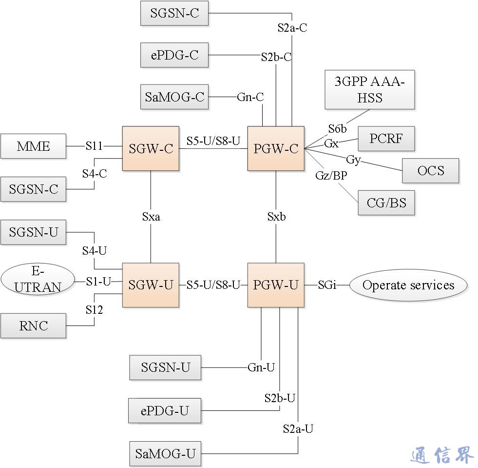 到了4.5G面向5G時代的R14階段,3GPP(3rd Generation Partnership Project,第三代合作伙伴計劃)確定網絡將再次向分離式的核心網構架演進,目的是讓網絡用戶面功能擺脫“中心化”的約束,使其既可靈活部署于核心網,也可部署于接入網(或接近接入網),這就是核心網用戶面下沉,同時也保留了控制面功能的中心化。這一次核心網的演進將用戶面和控制面徹底分開,是“全分離式”架構,在“全分離式”構架下,SGW(Serving Gateway,服務網關)和PGW(Packet Data Network Gateway,分組數據網關)被分離為控制面和用戶面兩部分,如圖4所示,SGW分離為SGW-C(控制面)和SGW-U(用戶名),PGW分離為PGW-C和PGW-U,同樣,SGSN也被分離為控制面(SGSN-C)和用戶面(SGSN-U)。