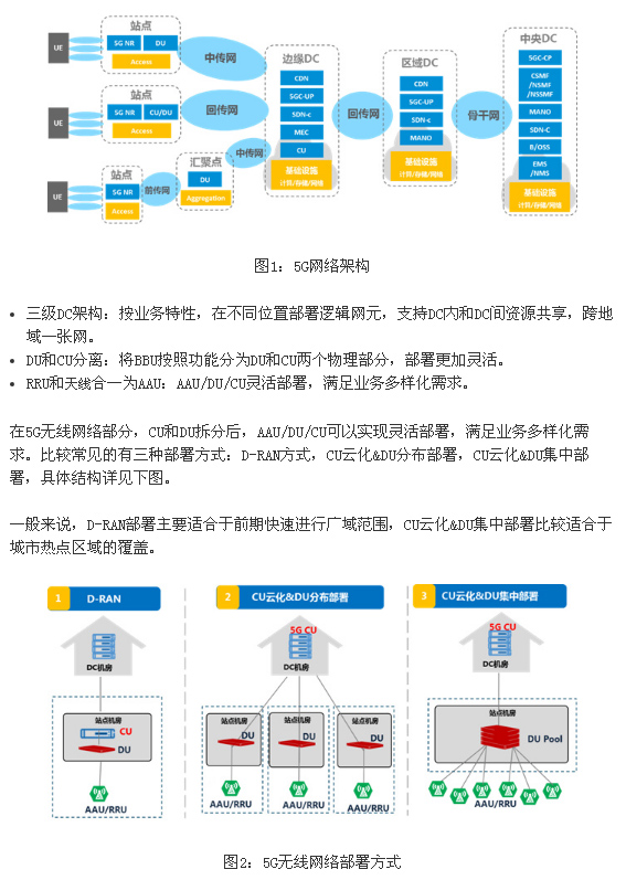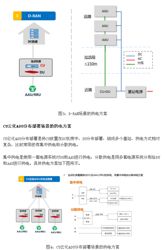 CU云化&DU集中部署是將CU放置在DC機房中,DU集中部署在同一個物理站址,通過光纖拉遠至遠端AAU組成基站,比較常用的有集中供電和分散供電。