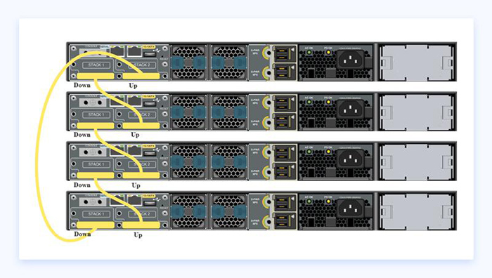 用通俗話理解就是將幾臺交換機疊放在一起,然后用專用線纜和模塊插在具有堆疊功能的端口上,將這幾臺交換機連接在一起,通過控制主交換機配置達到配置整個堆疊單元交換機的目的,只用一個IP地址就可以管理多個堆疊交換機,可以提高網絡效率,簡化管理。