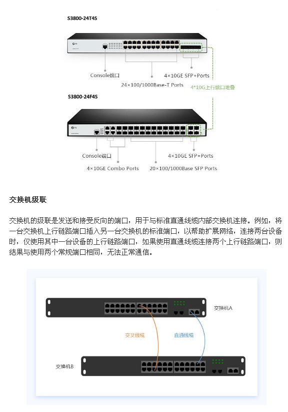 正如上面所說,它的弊端是必須用專用的線纜和模塊,在成本上會略高,不過也有一些支持堆疊的交換機嵌入了用于堆疊的上行鏈路端口,在成本上大大降低了,比如飛速(FS)可堆疊管理性交換機S3800-24T4S和可堆疊SFP可管理交換機S3800-24F4S。