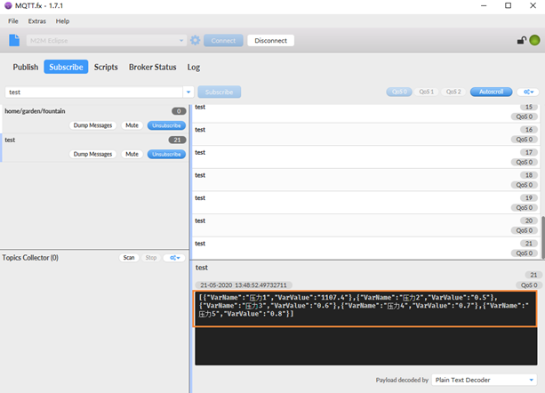 通過(guò)以上的相關(guān)部署,即可實(shí)現(xiàn)整個(gè)OPCUA+MQTT的實(shí)現(xiàn),實(shí)際應(yīng)用時(shí),只需要開啟一個(gè)MQTT客戶端,連接指定的MQTT服務(wù)器,并訂閱相應(yīng)的主題,即可獲取到設(shè)備層的實(shí)時(shí)數(shù)據(jù),這里使用一個(gè)常用的MQTT客戶端軟件,即MQTT.fx: