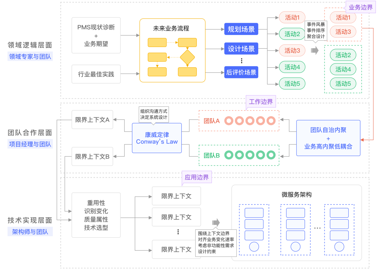 項目團隊在領域專家的帶領下通過對行業最佳實踐的學習以及對PMS現狀診斷及業務期望的分析,梳理系統全景業務流程并對流程進行業務邊界的劃分。基于業務邊界,依據康威定律劃分團隊,各團隊由領域專家和研發組成,每個團隊在各自的業務領域進行分析與設計,團隊間協作關系由項目經理進行協調。架構師在領域專家配合下,在技術實現層面進行微服務設計指導研發編碼實現。