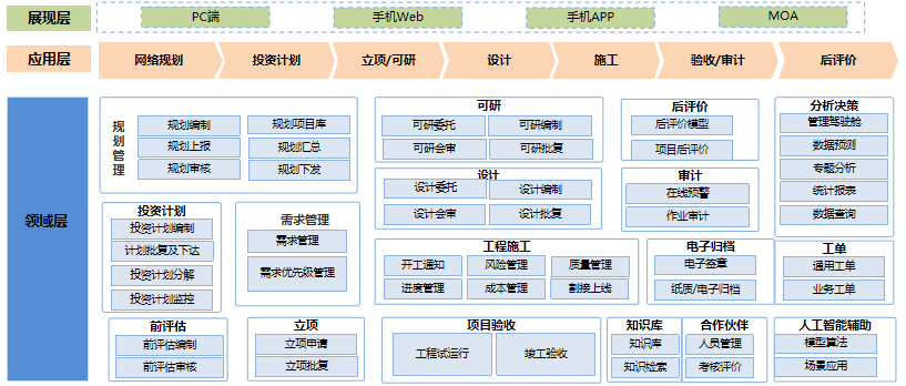 基于上述背景,中國移動集團啟動了集中化計劃建設系統的研發工作。集中化計劃建設管理系統是一個融管理, 業務, 架構于一體的管理系統,實現了計劃建設領域全生命周期流程覆蓋、全專業支撐,要求做到管理一體化、業務一體化以及架構一體化。