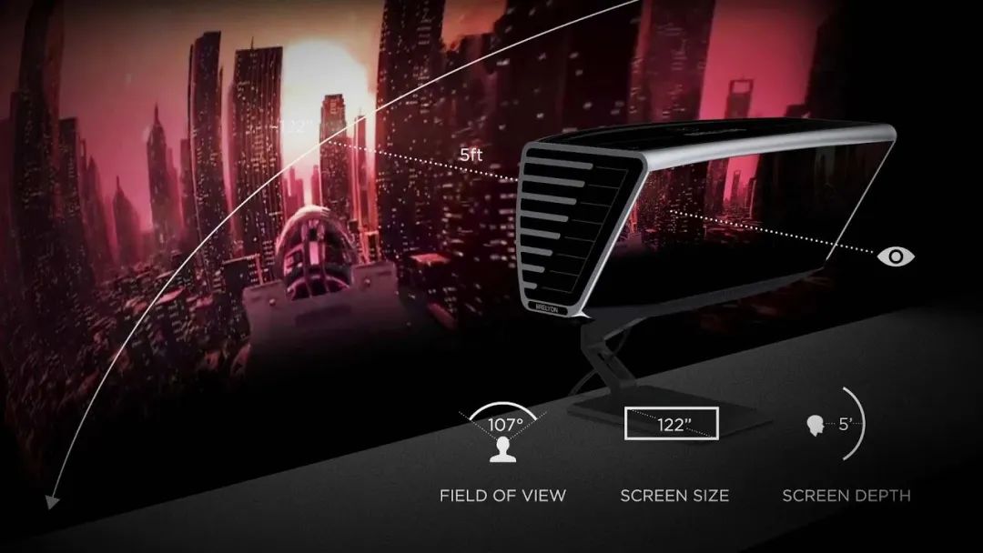 今年1月,Brelyon在拉斯維加斯的CES上首次展示了其技術,其研發(fā)的Ultra Reality擁有光場技術專利,使用精確的波前(wavefront)工程來創(chuàng)造擁有超大視場角和真實光學深度的圖層,生成沉浸式的虛擬全景顯示器,無需使用頭顯也能讓觀眾環(huán)繞在虛擬屏幕中。
