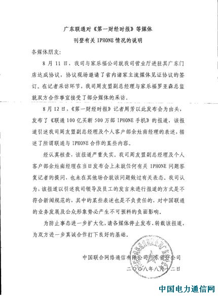 日前,中國聯通廣東省分公司向各大媒體發布聲明《廣東聯通對<第一財經時報>等媒體刊登有關IPHONE情況的說明》。