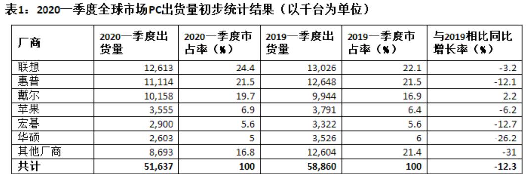 表1:2020一季度全球市場PC出貨量初步統計結果(以千臺為單位)
