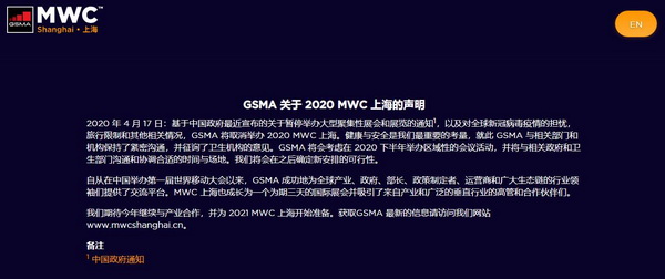 2020 年4 月17日:基于中國政府最近宣布的關于暫停舉辦大型聚集性展會和展覽的通知,以及對全球新冠病毒疫情的擔憂,旅行限制和其他相關情況,GSMA 將取消舉辦 2020 MWC 上海。健康與安全是我們最重要的考量,就此 GSMA 與相關部門和機構保持了緊密溝通,并征詢了衛生機構的意見。GSMA 將會考慮在 2020 下半年舉辦區域性的會議活動,并將與相關政府和衛生部門溝通和協調合適的時間與場地。我們將會在之后確定新安排的可行性。