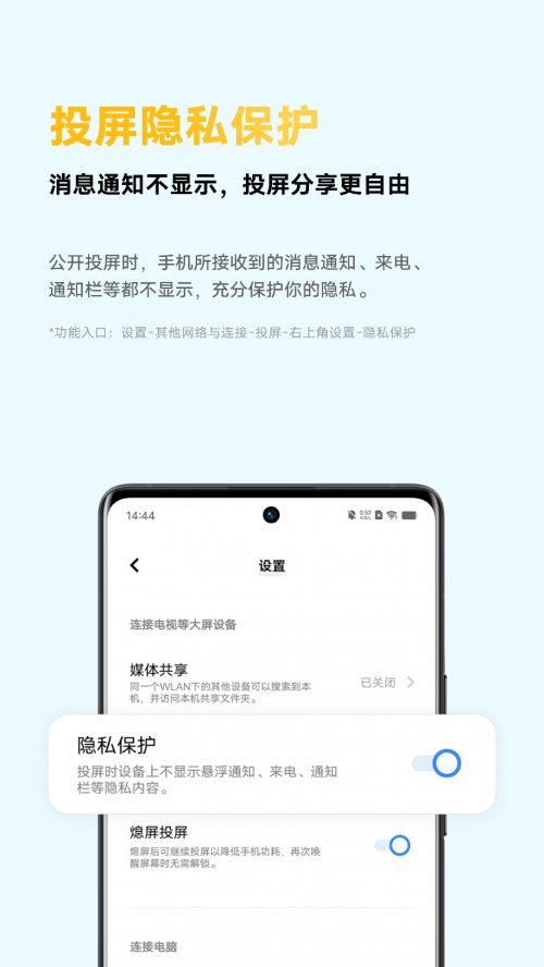 不顯示消息通知:當你用手機投屏分享相冊、文檔等或者播放電視,音樂等,開啟投屏隱私保護功能,會自動過濾如手機來電,APP推送、微信消息等相關通知,隱藏隱私信息;