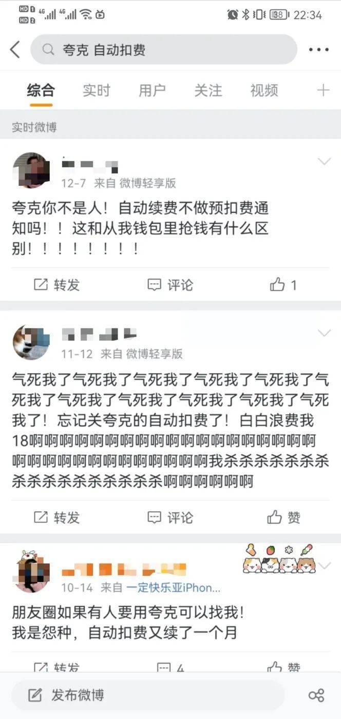 在各大社交媒體上,關于夸克會員自動扣費的吐槽高頻率出現,甚至在微博上輸入“夸克 自動扣費”關鍵詞,排在前面的不乏謾罵,以及帶有大量感嘆號的情緒宣泄。
