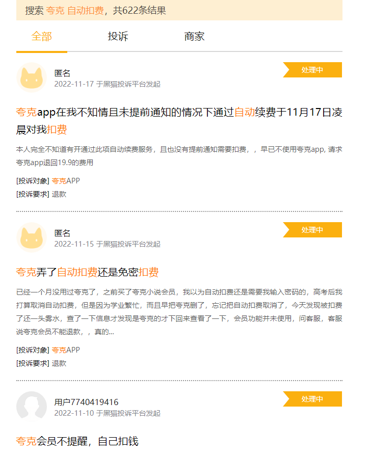 在黑貓投訴上,從11月底開始,就密集出現關于夸克亂收費的投訴,包括但不限于,沒開會員卻出現自動續費的扣款、不發任何相關信息及提示的情況下連續6個月自動扣款、宣傳三天免費會員卻直接扣款包月25元……