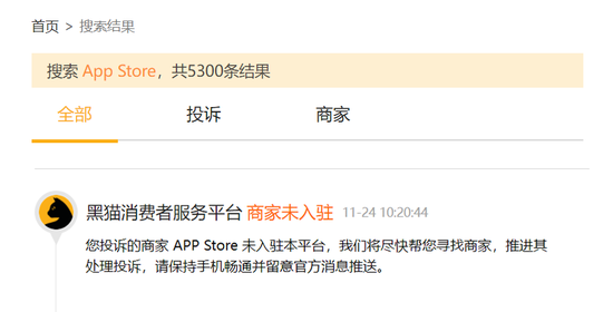 而在黑貓投訴平臺上,關于App Store的投訴共計有5300條,其中大多數都是“軟件亂扣費”、“App無法退款”、“App Store自動扣費”等問題。更令消費者失望的是,蘋果公司壓根沒有入駐黑貓投訴平臺,所以無法處理消費者投訴。