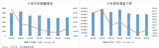 如下圖,2021Q2開始,小米的手機銷量增速和營收增速,雙雙持續下滑,并相繼呈現負增長。