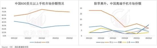 這在數據上已有印證。可以看到,2021Q2之后,小米、oppo、vivo等大眾品牌,市占率持續下滑。與之相反,蘋果市占率持續上升。
