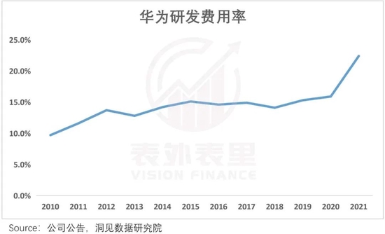 數據顯示,華為2012年之后的研發費用率穩步增長,平均維持在14%左右。且從2018年開始,其在研發上的絕對投入,持續突破千億級。