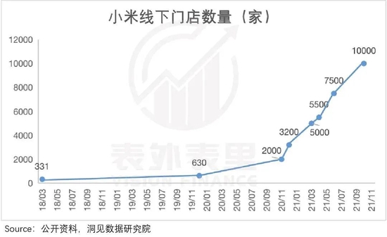 兩大問題得以改善下,小米的線下渠道拓展有了突破性進展。如下圖,截至2021年11月,小米線下渠道已達10000家。