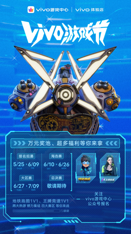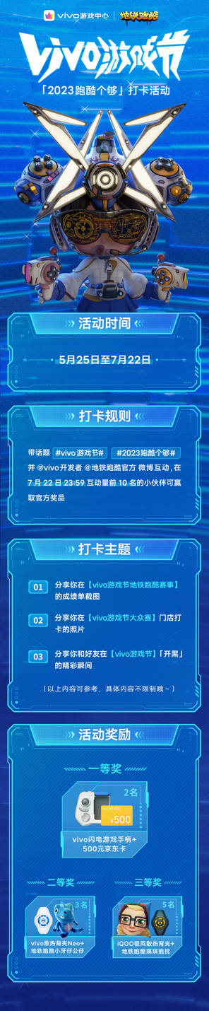 配合vivo大眾賽報名啟動,此次vivo游戲中心也將于5月25日同天開啟“2023年跑酷個夠”話題打卡活動,用戶可通過曬游戲成績、門店打卡、錄制視頻等方式參與打卡,7月22日活動截止當天微博互動量前十名的小伙伴們將有機會贏取vivo游戲手柄、散熱背夾、游戲周邊等驚喜獎品。除vivo大眾賽外,vivo也將于6月正式啟動游戲中心線上挑戰(zhàn)賽報名,賽事主要以游戲地鐵跑酷的無盡模式進行選拔,并在指定時間內決出玩家名次后進行獎勵,選手們也可通過游戲內及vivo游戲中心的活動頁實時瀏覽個人排名。