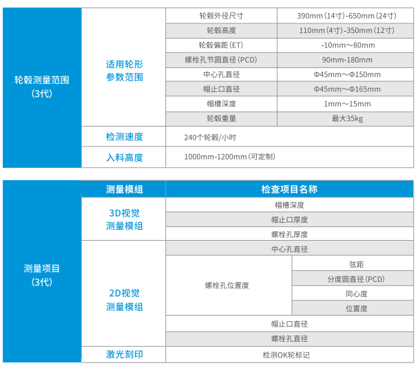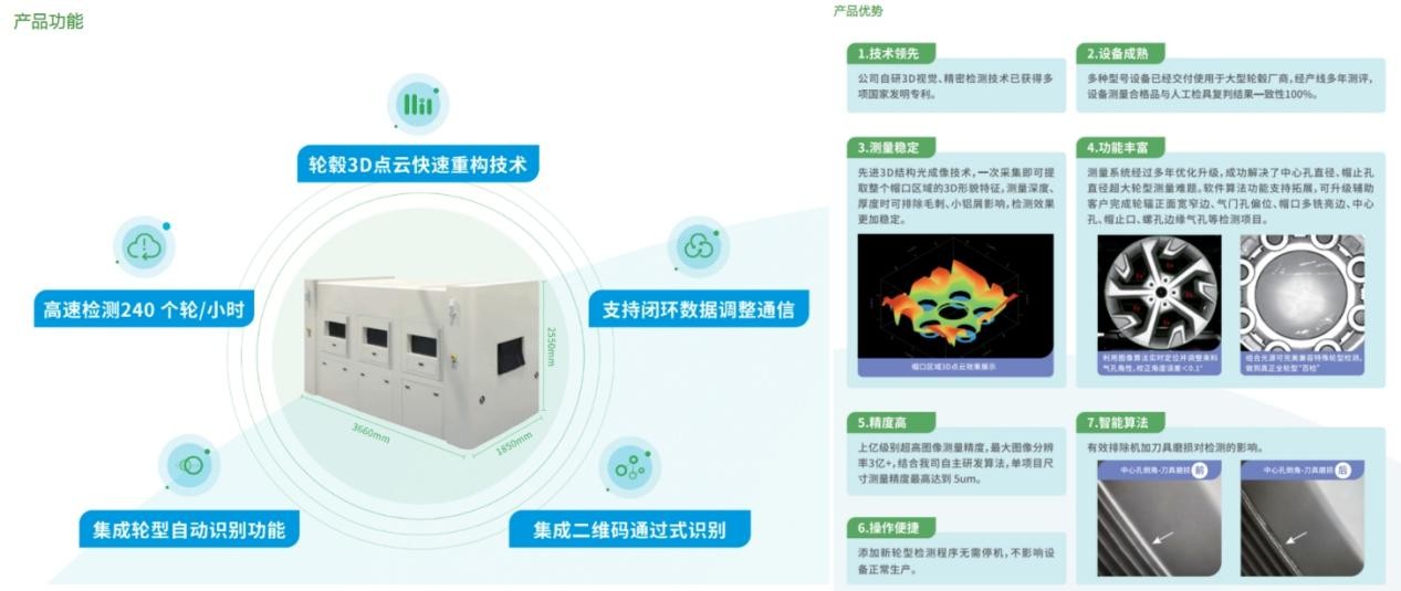 這款產品是以非接觸式的測量方式,做到快速、無損傷的對輪轂進行在線測量。設備集成了輪型自動識別功能和二維碼讀取功能,整套設備可對接物流產線,內部對輪轂進行自動識別和姿態調整,通過超高圖像測量精度對輪轂尺寸及形位公差進行測量,返回來料狀態,從而有效分揀合格品和不合格品分流到對應物流輥道。